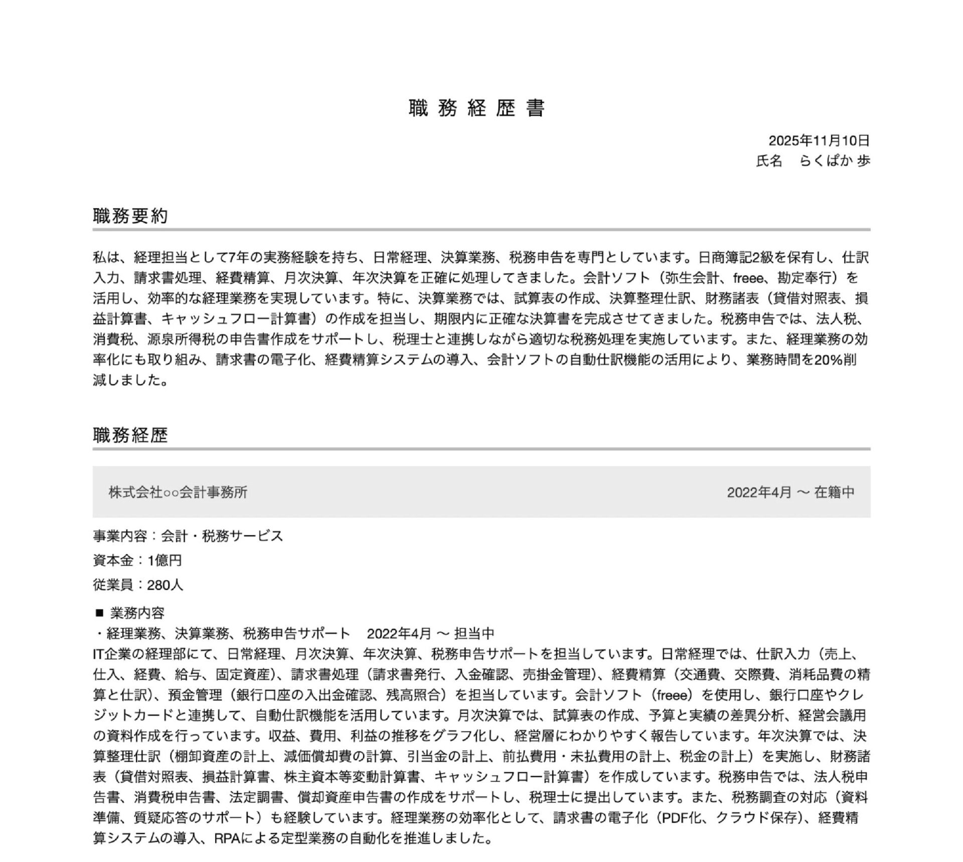 職務要約は、入力した職歴情報をもとにAIで自動生成できます。経理・財務職では、決算処理や予算管理、財務分析などの経験を反映させると、採用担当者に専門性や即戦力感を伝えやすくなります。