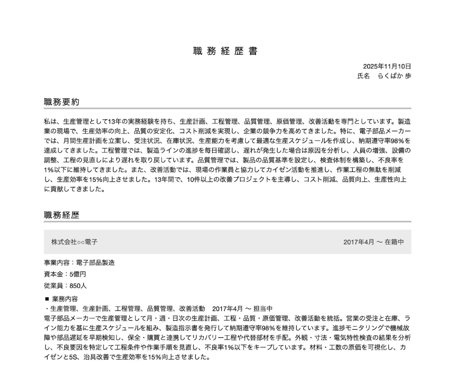 職務要約は、入力済みの職歴データをもとにAIで自動生成できます。製造・生産管理職では、工程改善・品質管理・納期調整など幅広い業務内容があるため、自身の経験に沿って重視しているポイントを反映させましょう。AI生成後は、文章の精度を確認し、表現を調整することでより適切な要約になります。